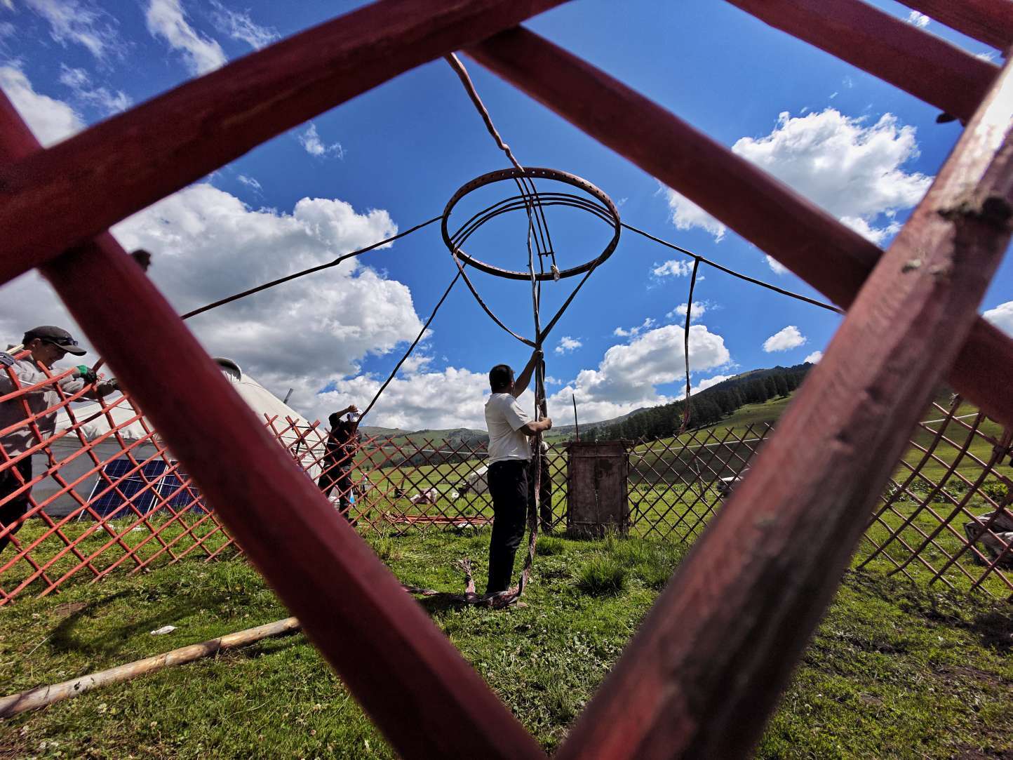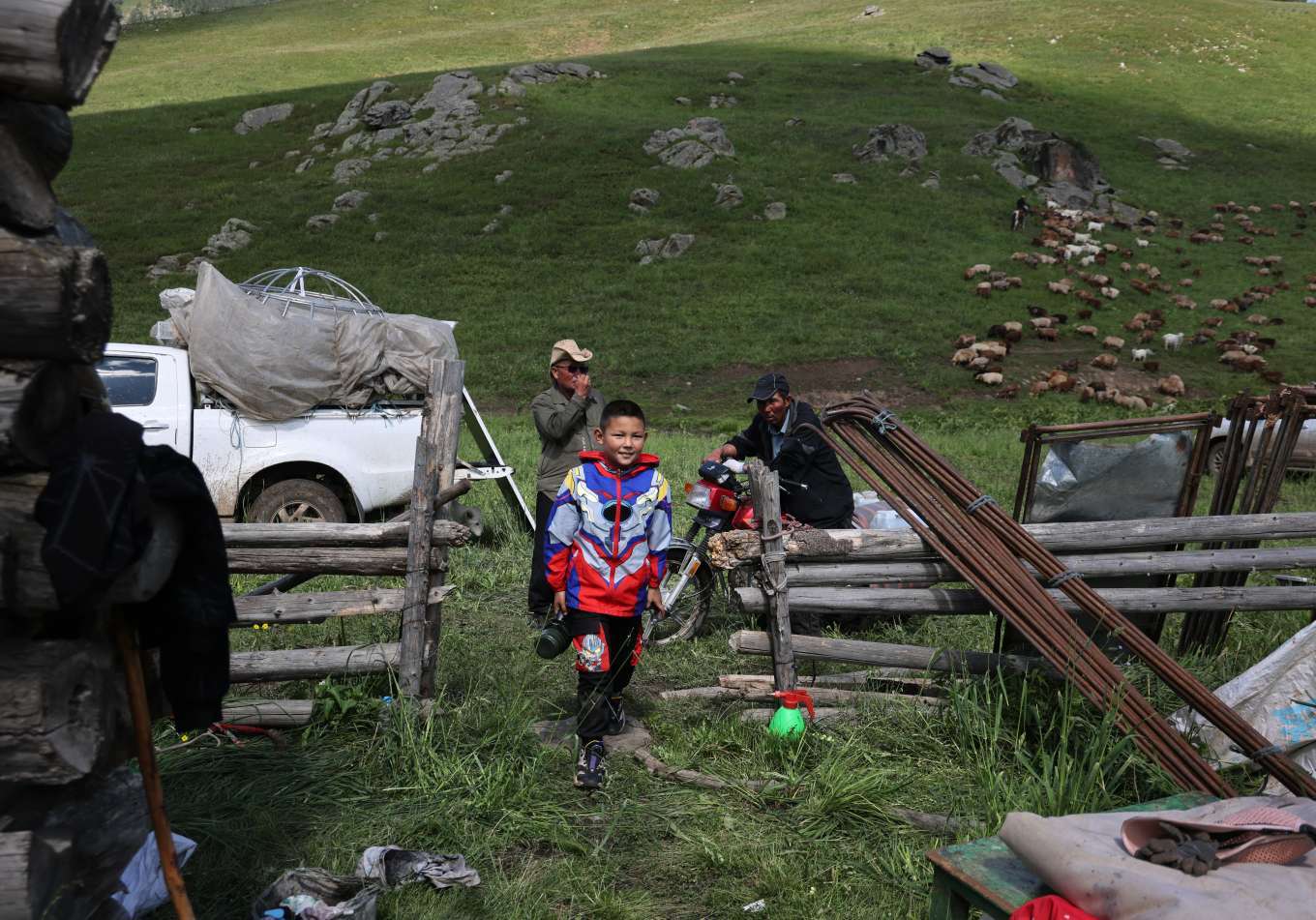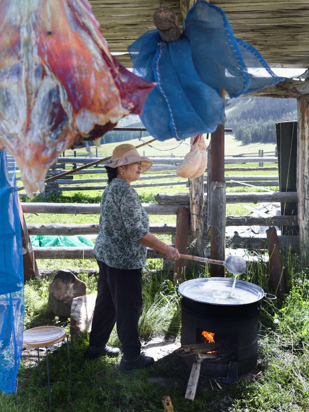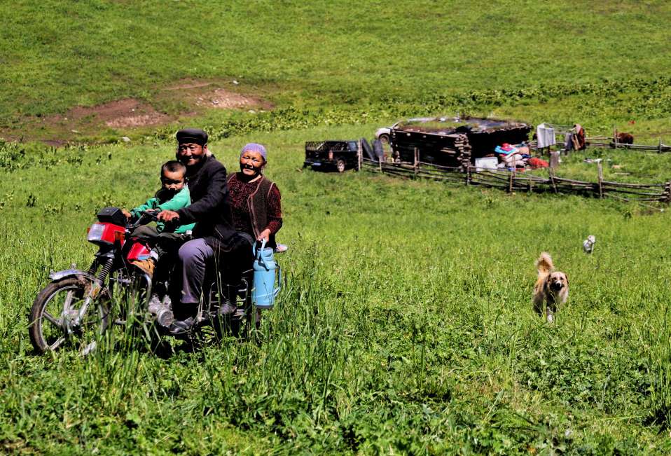 走进牧民生活,处处是烟火温情。摩托载着一家人穿梭草场,老人笑纹里藏着岁月沉淀,孩子眼眸闪烁好奇,小狗欢快追逐;毡房、车辆旁,是劳作的身影,搭建、整理,为生活添砖加瓦;棚下,主妇执勺烧牛奶,挂着的肉品预示着佳肴将成,烟火气缭绕,晕染出平凡又珍贵的日常。