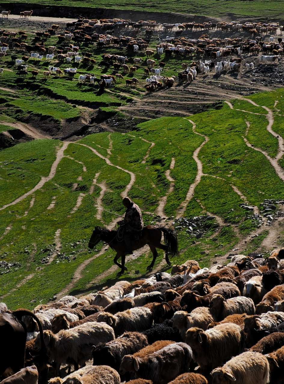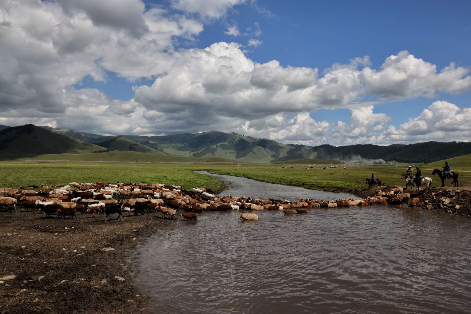 河流蜿蜒穿过牧场,牲畜饮水、嬉戏,牧民骑马守望,山水相依,人畜相谐。这一方天地,自然慷慨馈赠,牧民以坚韧与热爱回应。